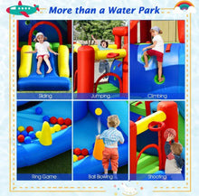 - This bounce house includes a long slide, trampoline, climbing wall, splash pool, water cannon, ball pit area, basketball rim, ring game, and ball blowing.