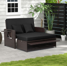 3-in-1 Multifunctional Sofa Set: This patio set can be used as a double chaise lounge/daybed with its combination of a loveseat sofa and ottoman. The 4-level adjustable backrest allows for sitting, reclining, or lying flat for different outdoor activities. The 2 retractable side trays make it convenient to access drinks and snacks. When the ottoman cushion is removed, the set can be used as a double sofa with a side table.